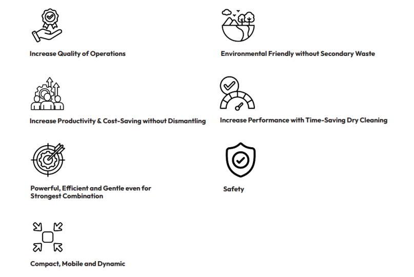 Let’s talk advantages – ASCOJET Dry Ice Blasting is not only dry, gentle, and powerful but also non-abrasive. The best part? No dismantling of moulds is required, and there’s no residual material or secondary waste. This not only saves costs but also makes it a compact, mobile, and environmentally friendly solution.
